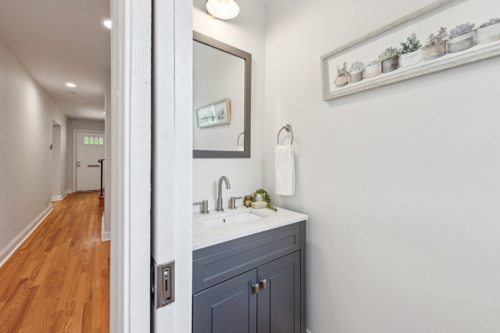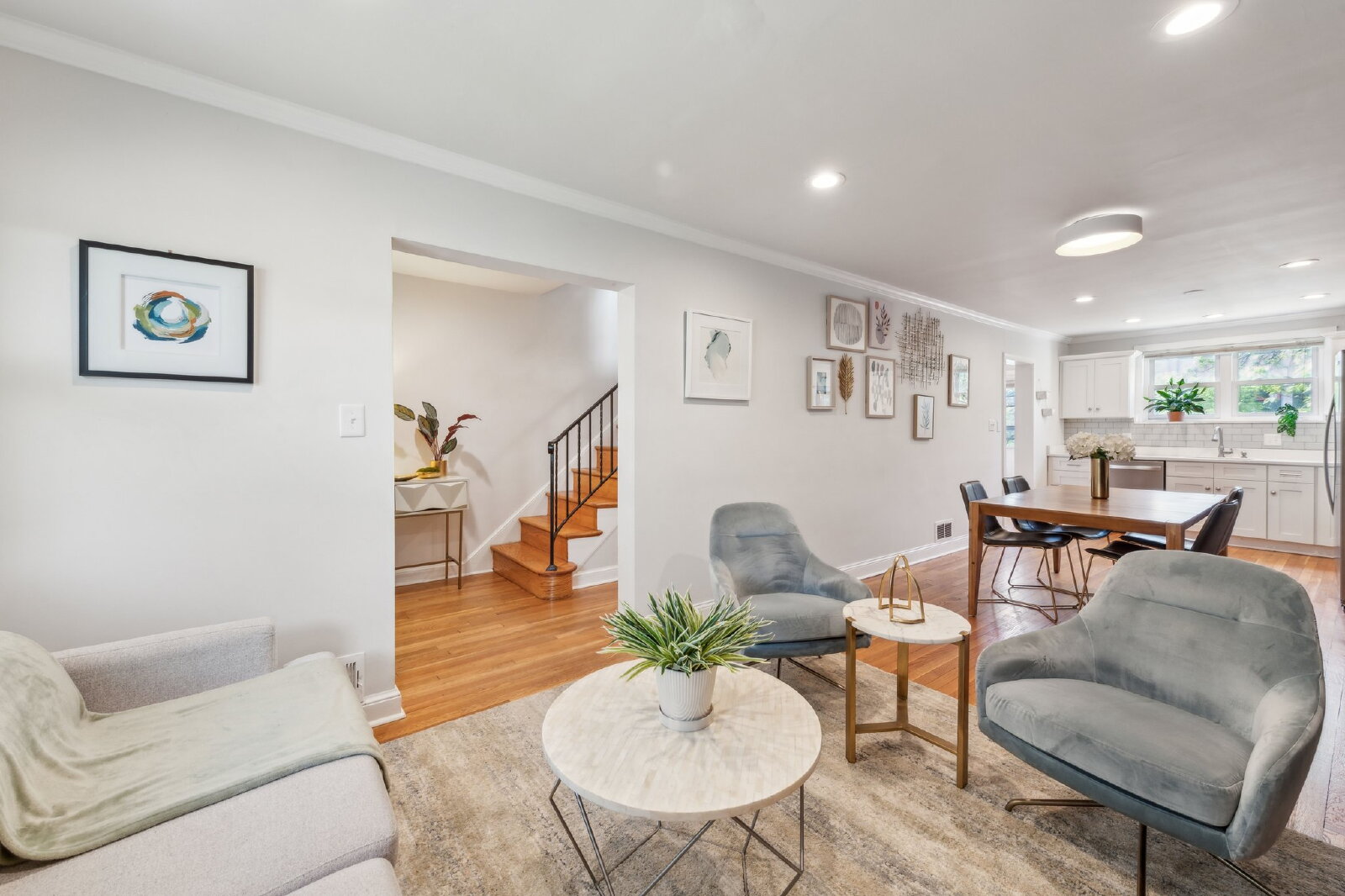 Offering over 1,780 square feet across three finished levels, this home blends modern comfort with classic D.C. charm. Step into an open main level filled with natural light and hardwood floors. The bright, white kitchen features quartz countertops, stainless steel appliances, and a subway tile backsplash, flowing seamlessly into the dining and living areas — perfect for entertaining. A convenient half bath is also located on this level.